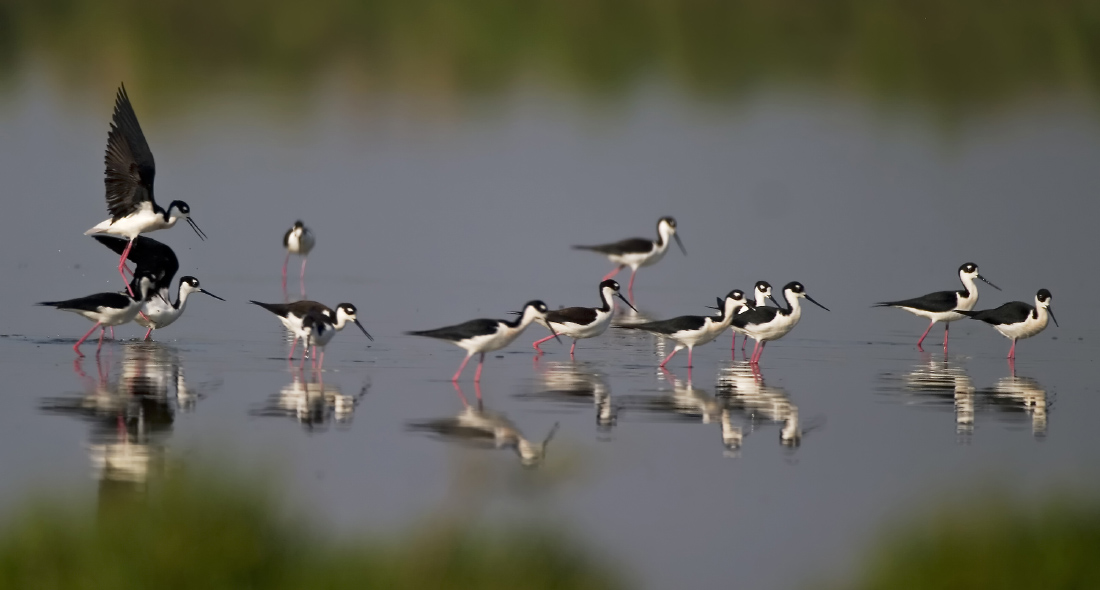 Black-necked Stilts adapt well to their requisite man-made, shallow impoundments, and breed in both fresh and tidal wetlands. Nest scrapes are situated on islands, dikes, tussocks or elevated platforms close to water, and less frequently on mats of floating vegetation.