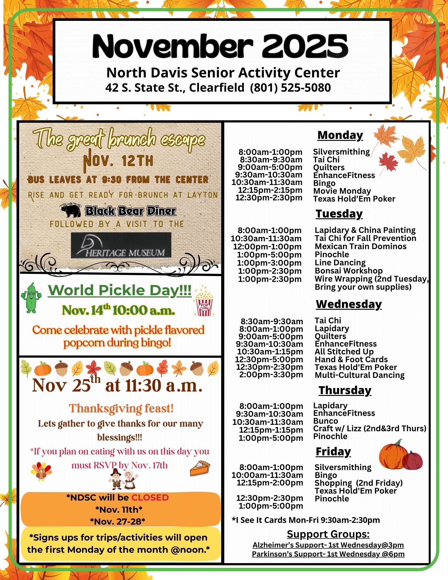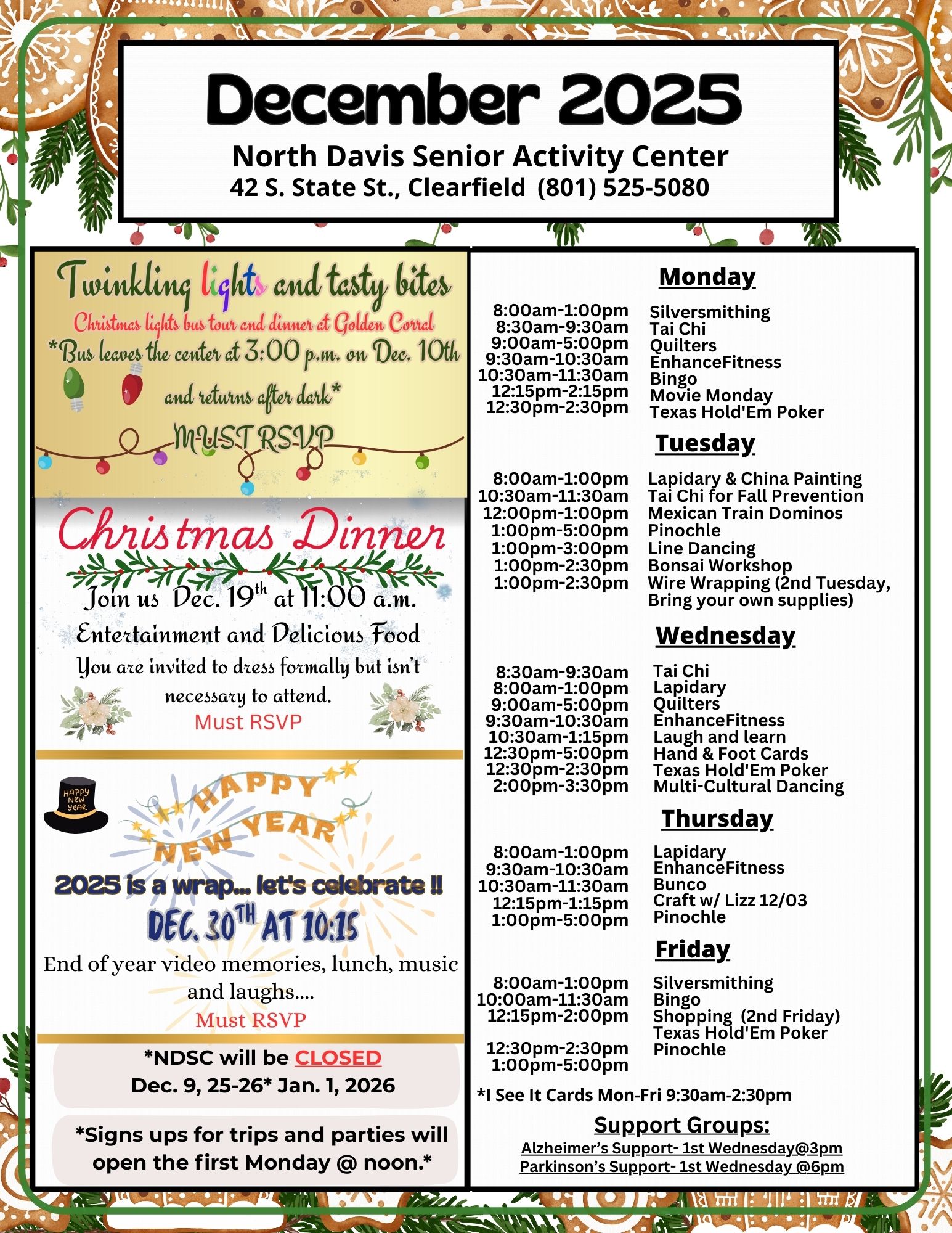 The North Davis Senior Activity Center in Clearfield, Utah, serves seniors in Clearfield, northern Layton, South Weber, Syracuse, Clinton, Sunset, and West Point. Our center offers a comprehensive range of programs to enlighten, educate and enrich the lives of active adults age 60 and over. We provide a welcoming space for seniors to socialize and participate in a variety of fun activities such as exercise classes, card games, educational classes, crafting, outings, and much more.