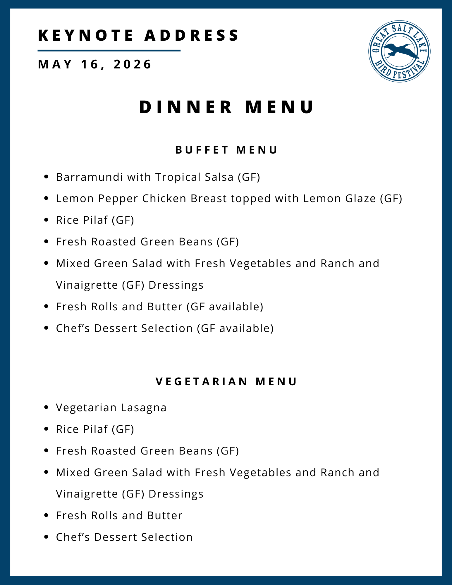 Tickets are required to attend the Keynote Address and can be purchased during the online registration process. Options to purchase a vegetarian or gluten free meal ticket will be available. View the dinner menu here.