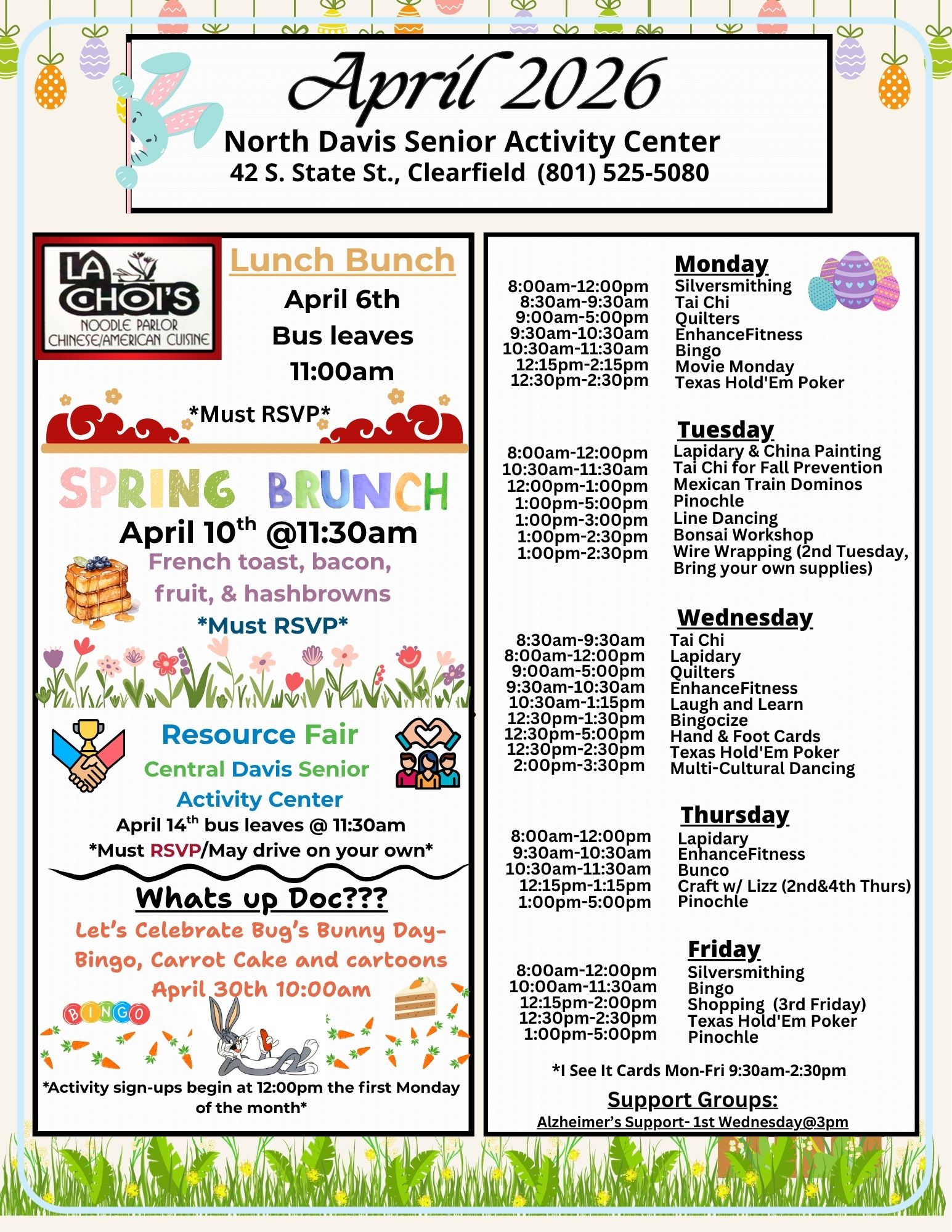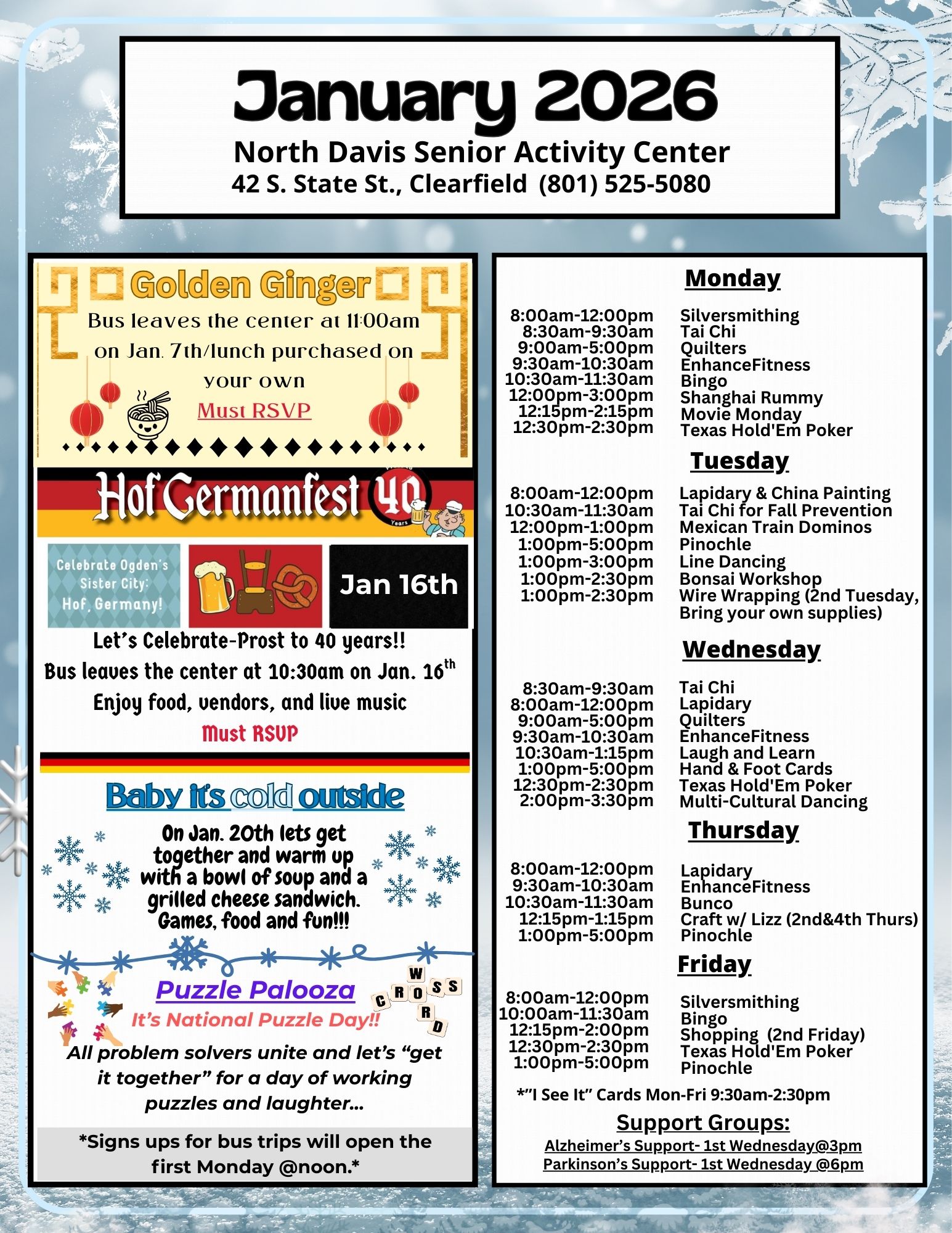 The North Davis Senior Activity Center in Clearfield, Utah, serves seniors in Clearfield, northern Layton, South Weber, Syracuse, Clinton, Sunset, and West Point. Our center offers a comprehensive range of programs to enlighten, educate and enrich the lives of active adults age 60 and over. We provide a welcoming space for seniors to socialize and participate in a variety of fun activities such as exercise classes, card games, educational classes, crafting, outings, and much more.